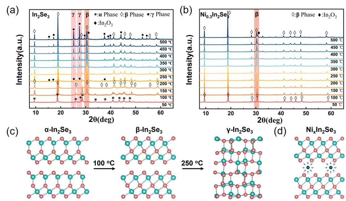 图2 Ni插层对In2 Se3 相稳定性的影响:(a-b)原位XRD揭示In2 Se3 和Ni0.3 In2 Se3 在50-500℃温度范围内的相结构变化;(c-d)In2 Se3 和Ni0.3 In2 Se3 不同的相转变行为示意图