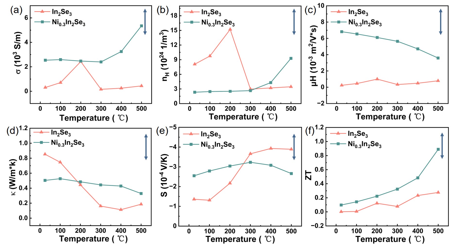 图3 In2 Se3 和Ni0.3 In2 Se3 在室温至500℃温度范围内沿面外方向的物性对比:(a)电导率;(b)载流子浓度;(c)载流子迁移率;(d)热导率;(e)塞贝克系数;(f)热电ZT值