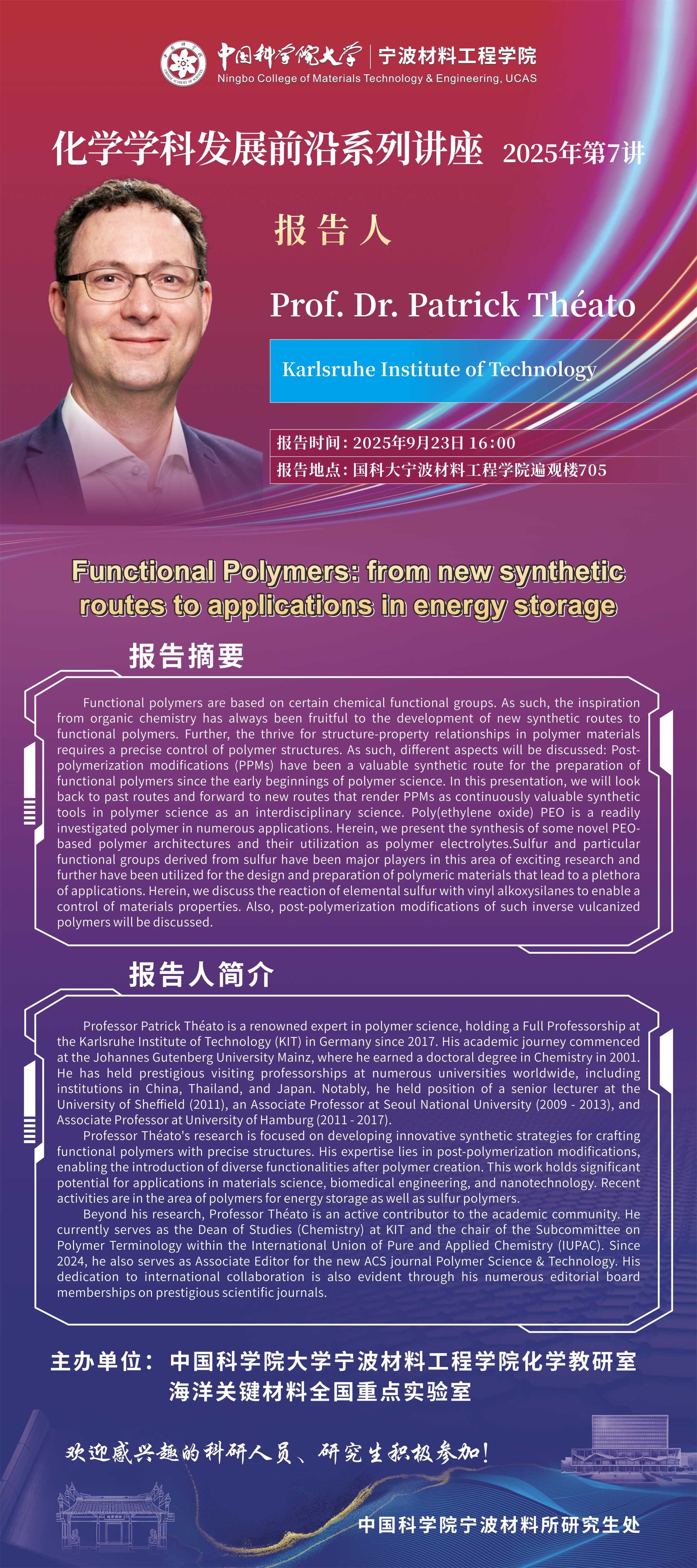 9月23日:Prof. Dr. Patrick Theato:Functional Polymers from new synthetic routes to applications in energy storage