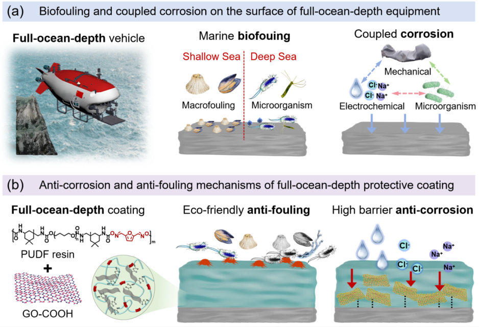 随着深海探测与开发加速推进,海洋工程正迈向全海深(Full-Ocean-Depth)作业阶段。极端高压、高盐度及复杂微生物群落使装备易遭受污损与腐蚀耦合破坏,严重威胁长期服役。目前多层防护体系因界面剥离和功能衰减难以适应极端环境,因此,在单一涂层中实现防污/防腐协同防护已成为亟待攻克的技术难题。