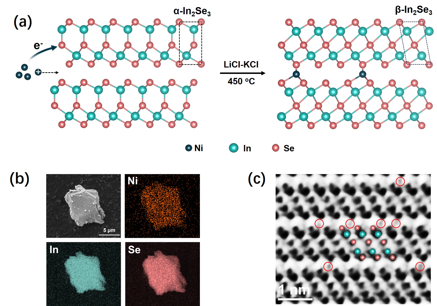 图1 (a)Ni原子插层In2 Se3 过程示意图;(b)扫描电镜和能谱分析显示Ni插层In2 Se3 样品的形貌和元素分布;(c)高分辨球差电镜显示Ni0.3 In2 Se3 的原子结构,其中Ni原子在In2 Se3 层间随机分布
